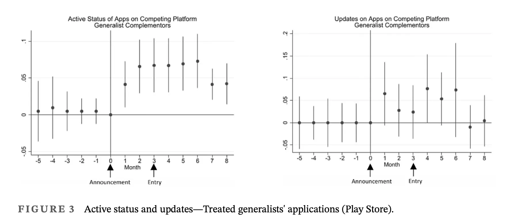 “Overall, the findings suggest that generalist firms activate an outside option once faced with a competitor who is the platform owner, whereas specialists double down on the affected area but also keep their options open in unaffected areas. Interestingly, entry into a complementor's market can be a double-edged sword for the entering platform owner. On the one hand, entry can create rents for the platform owner while also increasing effort in the target domain by specialists. On the other hand, generalists with experience on competing platforms are also more likely to shift their effort to them. Remarkably, even products not directly affected by the platform owner entry see a higher likelihood of being abandoned by generalist firms. This suggests that while platform owner entry can encourage effort on the focal platform by specialist firms, it could be also pushing generalists to increase their effort on competing platforms. Platform owner entry thus directly shapes complementor behavior and outcomes as well as the industry structure at a much broader scope than previously known (Chen et al., 2022; Rietveld & Schilling, 2021).”