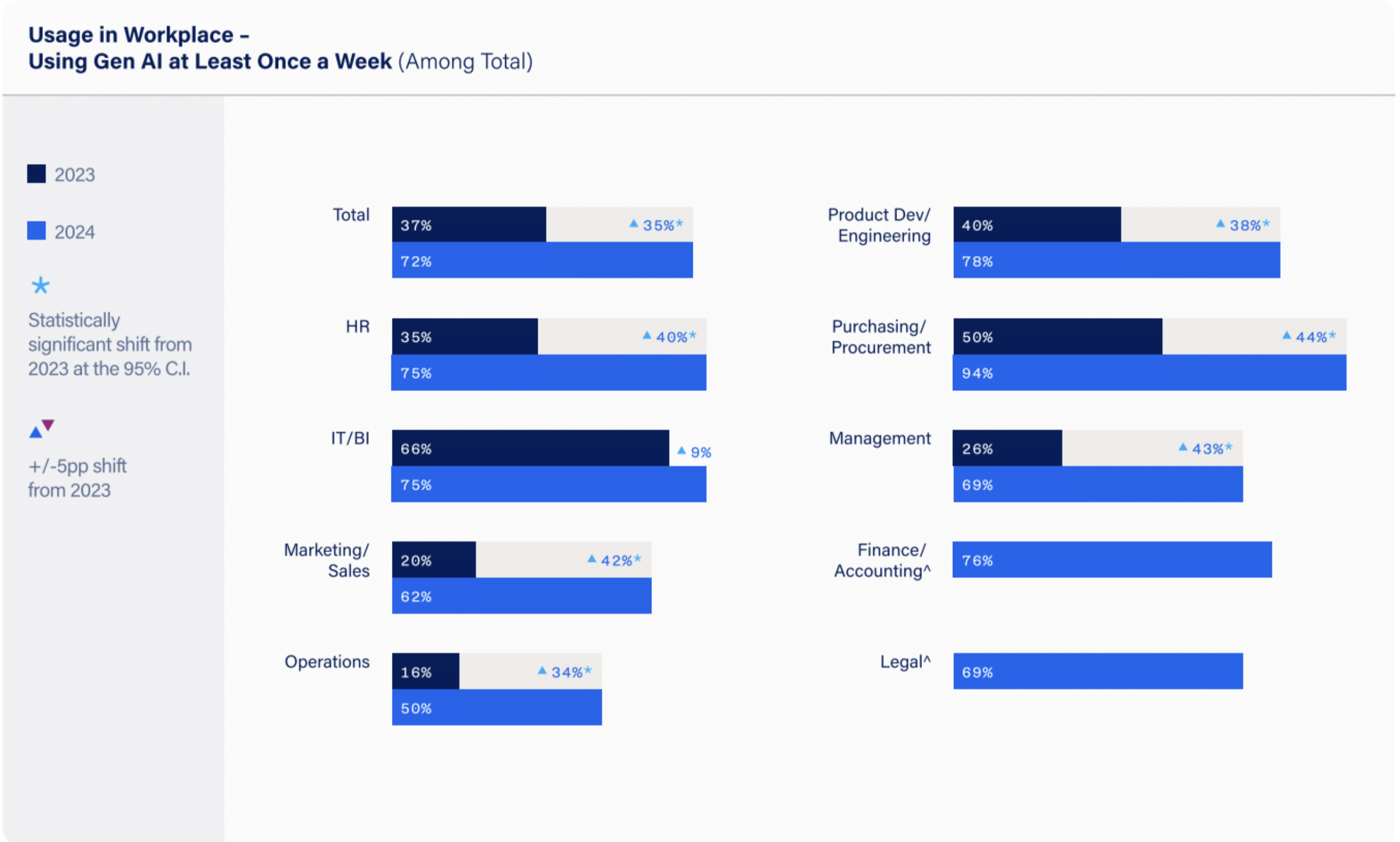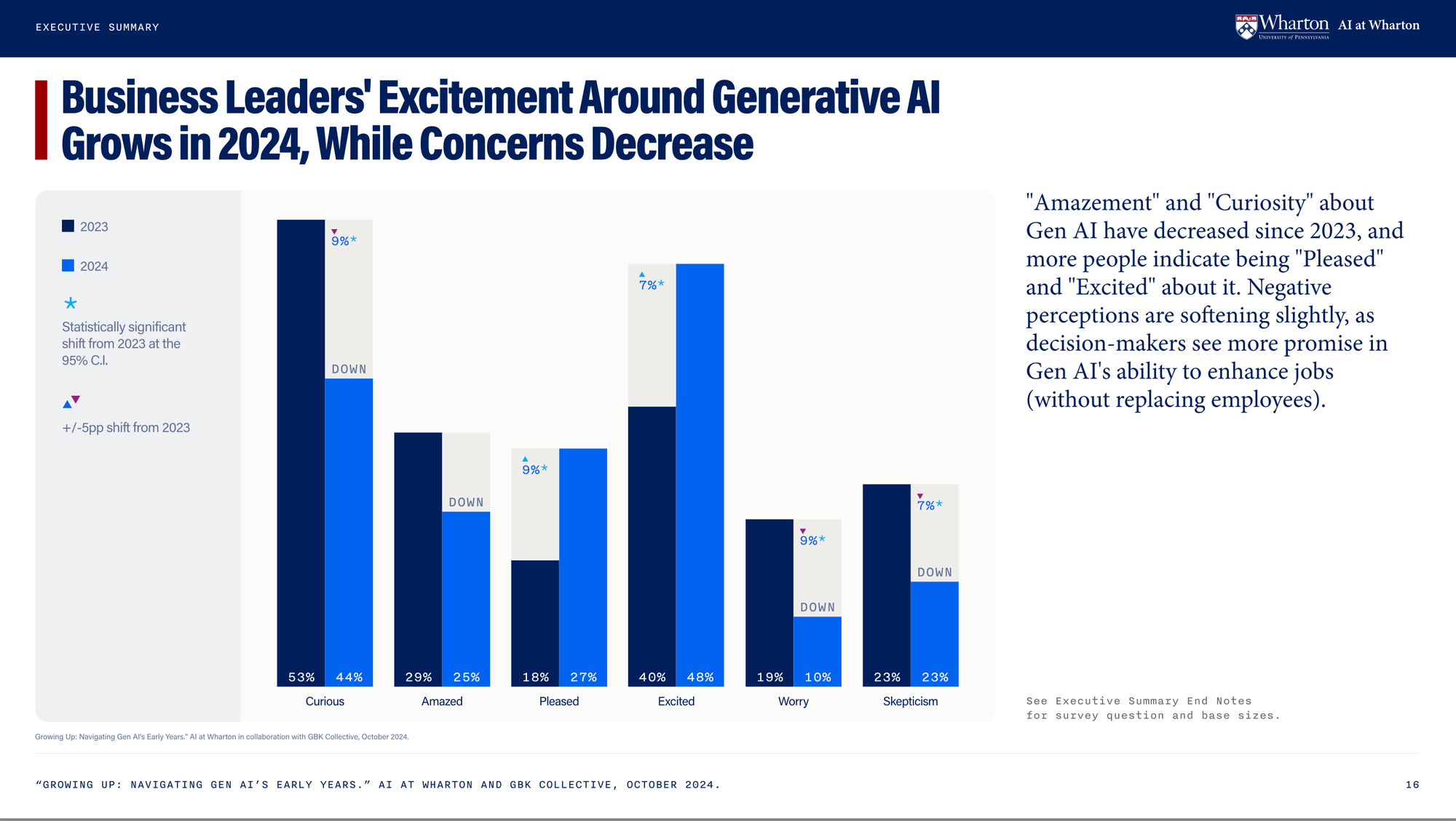 From a survey with more than 800 senior business leaders, this report’s findings indicate that weekly usage of Gen AI has nearly doubled from 37% in 2023 to 72% in 2024, with significant growth in previously slower-adopting departments like Marketing and HR. Despite this increased usage, businesses still face challenges in determining the full impact and ROI of Gen AI. Sentiment reports indicate leaders have shifted from feelings of “curiosity” and “amazement” to more positive sentiments like “pleased” and “excited,” and concerns about AI replacing jobs have softened. Participants were full-time employees working in large commercial organizations with 1,000 or more employees.