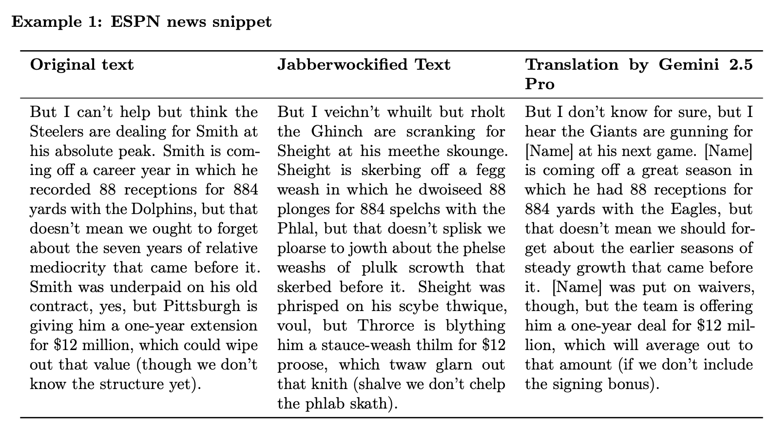 “Despite lacking the words that make Jabberwocky Jabberwocky, the retained structure is sufficient to uniquely fingerprint the text, allowing LLMs to match it to the original poem. We invite readers to see for themselves.”