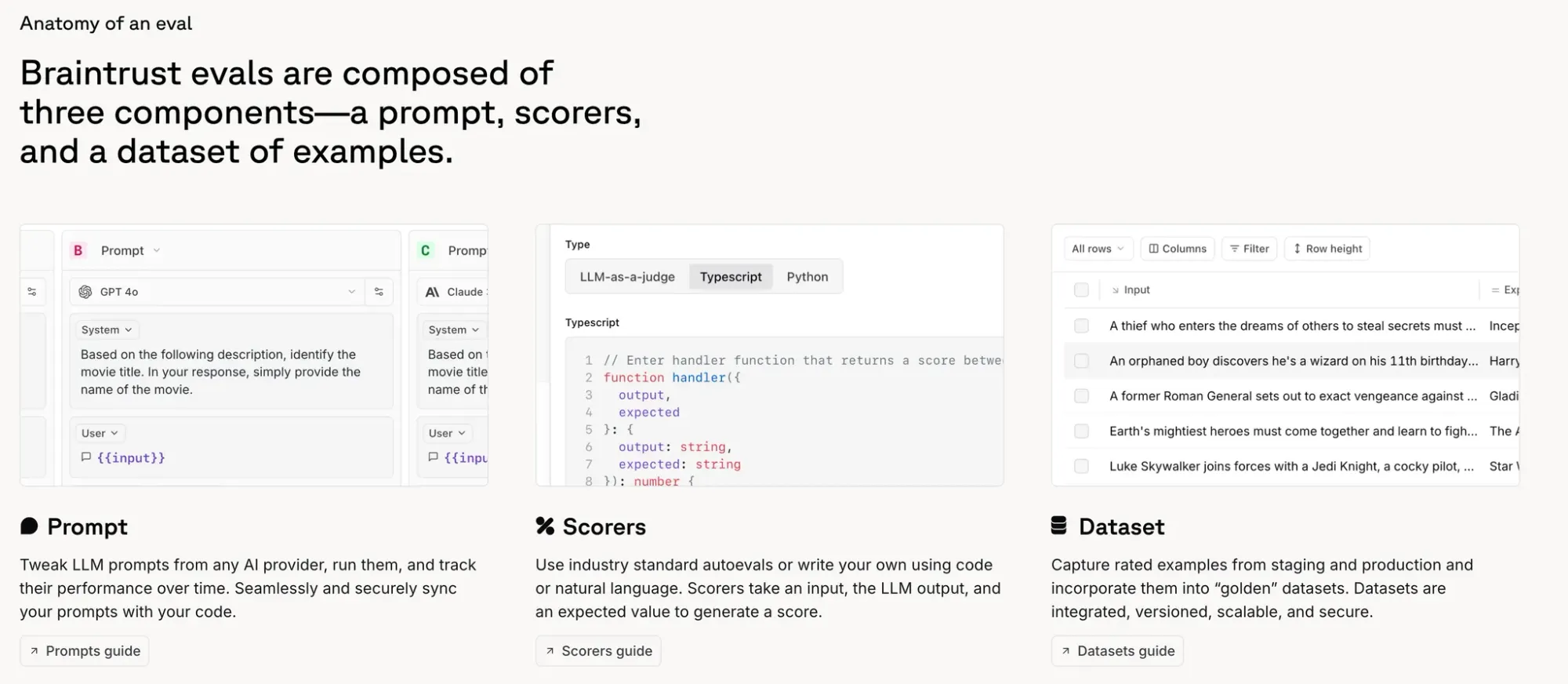 Braintrust evals are composed of three components — a prompt, scorers, and examples