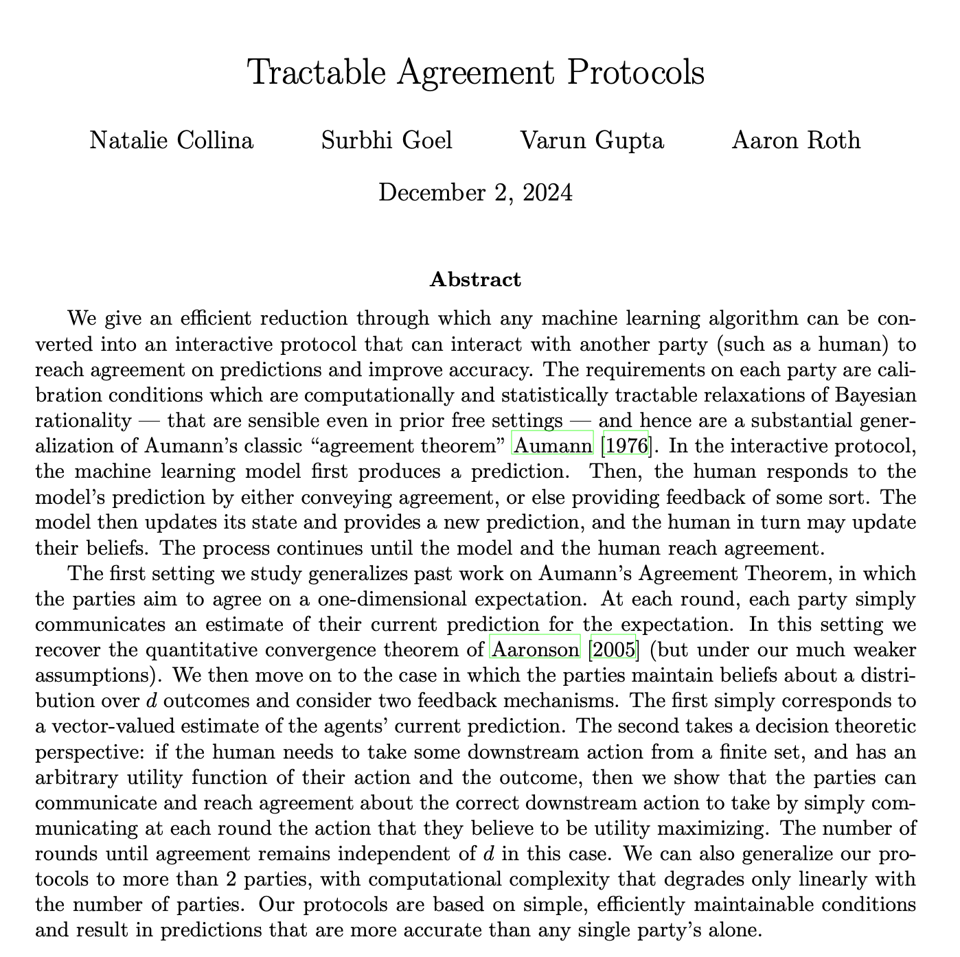 Collina, N., Goel, S., Gupta, V., & Roth, A. (2024). Tractable Agreement Protocols. arXiv preprint arXiv:2411.19791.